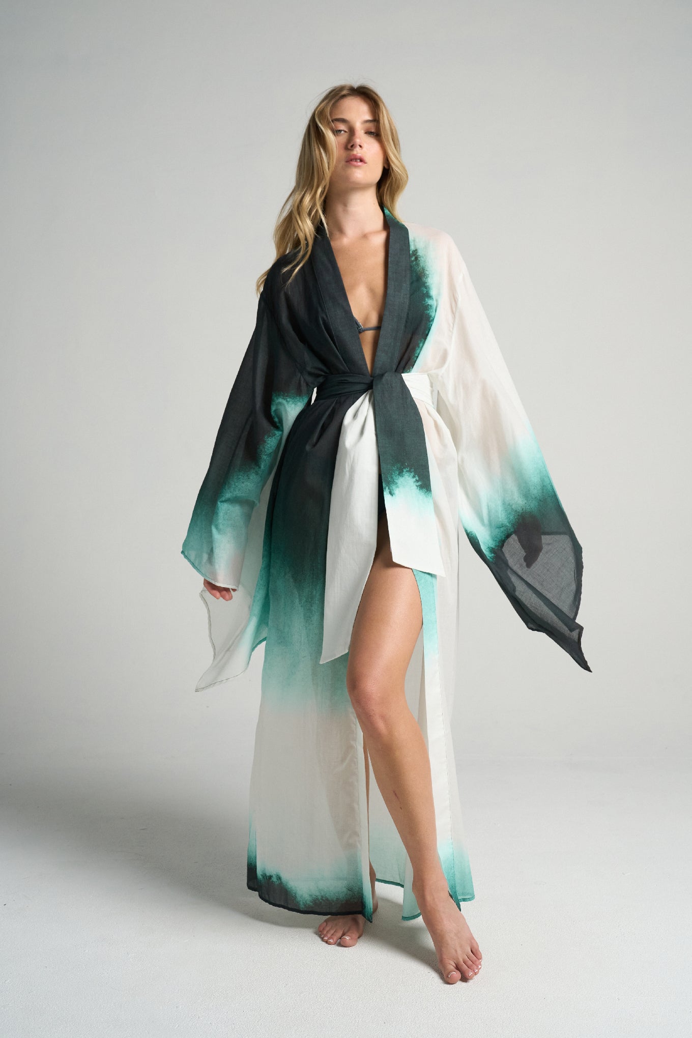 Elevate your wardrobe with the SIGAL Bell Sleeve Kimono Green Ink. Made from 100% cotton, this kimono offers the perfect balance of breathability, comfort, and effortless elegance. The hand-painted green gradient ink design by SIGAL adds a unique artistic touch, making it a statement piece for any refined resort wear collection.