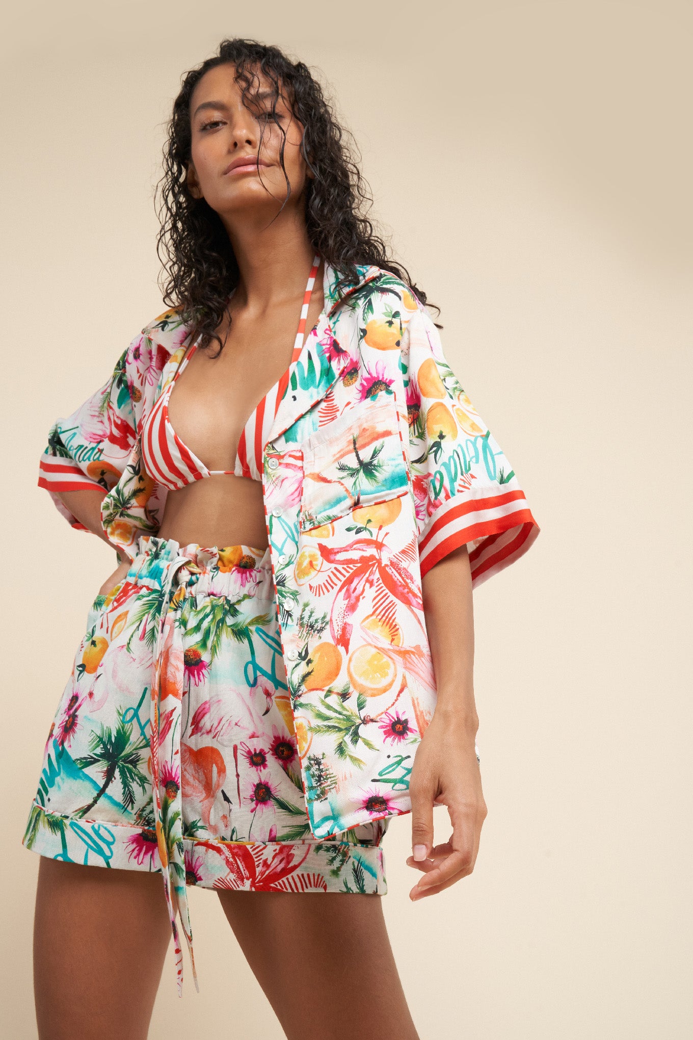 The SIGAL Paper bag shorts are a relaxed yet sophisticated resort wear staple. Elastic high waistband with a wide fabric drawcord. Cuffs come rolled at bottom hem. Cuff and front pockets with piping. Handcrafted in Cotton/Linen fabric, it features a hand drawn print by SIGAL herself.