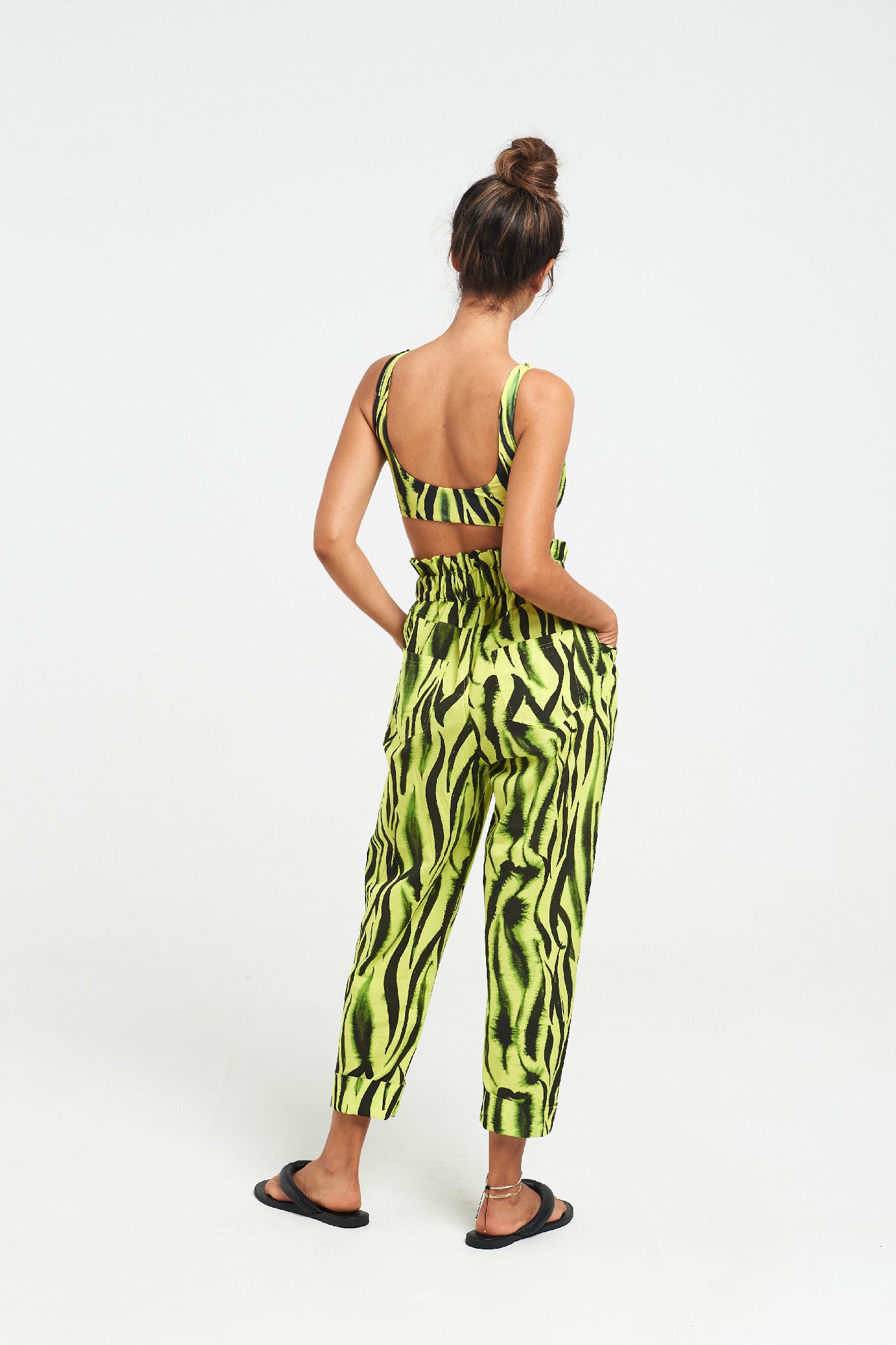 The SIGAL Paper bag pants are a relaxed yet sophisticated resort wear staple. Elastic high waistband with a wide fabric drawcord. Cuffs can be rolled at bottom hem. Front pockets with piping, back pockets with denim style stitching. Handcrafted in Cotton/Linen fabric, it features a hand drawn, neon animal print.