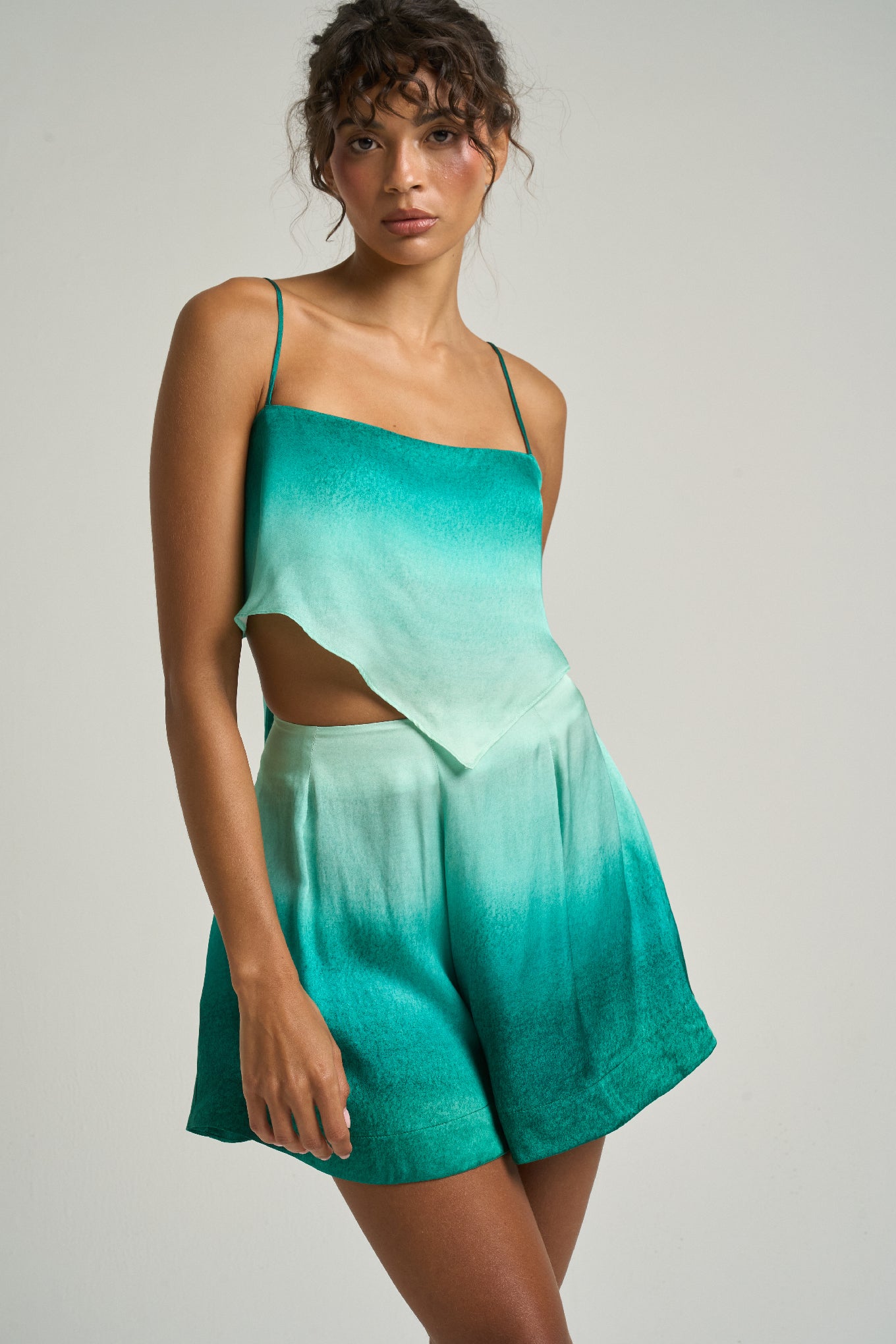 The SIGAL Flared Shorts: Mist combine comfort and elegance in a breezy, feminine silhouette. Made from 100% viscose, they offer a soft, lightweight drape that moves beautifully with every step. The Mist gradient print mirrors the depth of ocean tones, blending rich greens into airy light shades for a fluid, painterly finish.