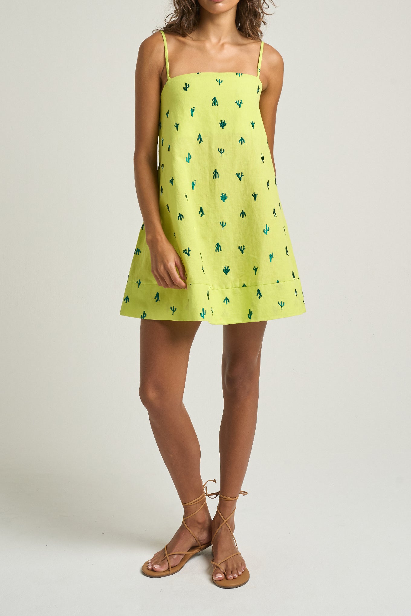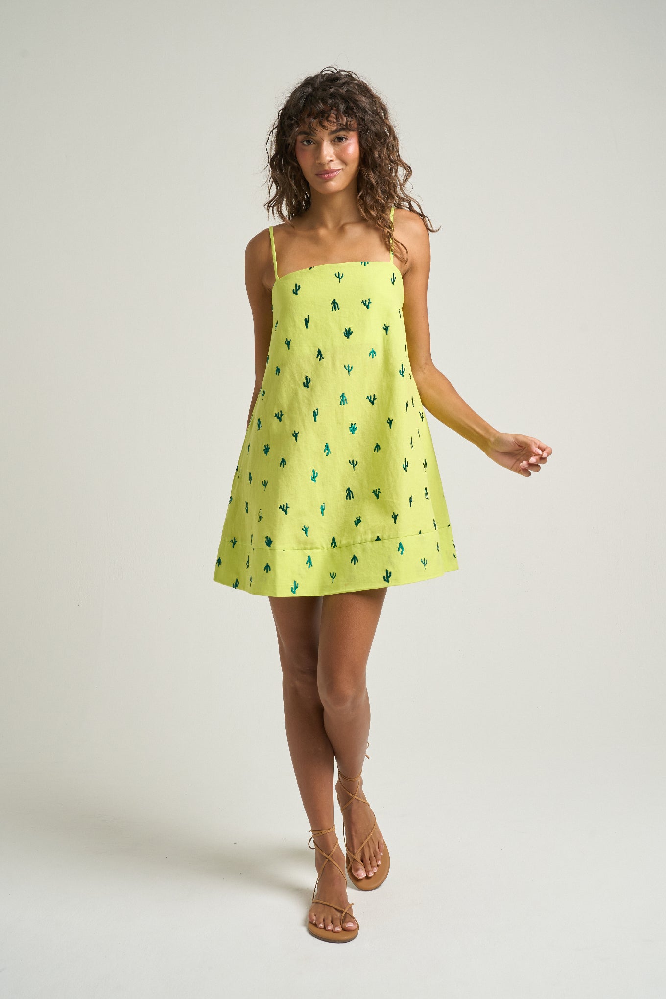 The SIGAL Mini Strappy Trapeze Dress: Cactus Yellow radiates playful warmth with a desert-inspired touch. Crafted from a breathable blend of 72% cotton and 28% linen, this lightweight silhouette offers natural texture and effortless movement. The soft yellow base is adorned with delicate hand-drawn cactus motifs, creating a fresh, sunlit aesthetic that feels both joyful and refined.