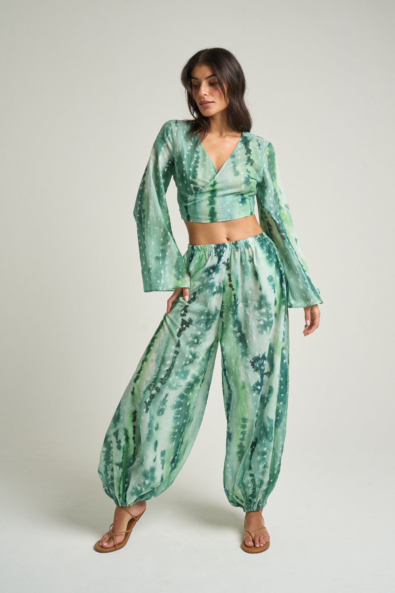 The SIGAL Wrap Top: Saguaro blends fluid elegance with expressive artistry. Crafted from 100% cotton voile, this lightweight fabric offers a soft, airy feel that drapes beautifully against the body. The hand-painted Saguaro print features layered emerald tones inspired by desert landscapes and cactus textures, transforming the piece into a striking yet refined statement.
