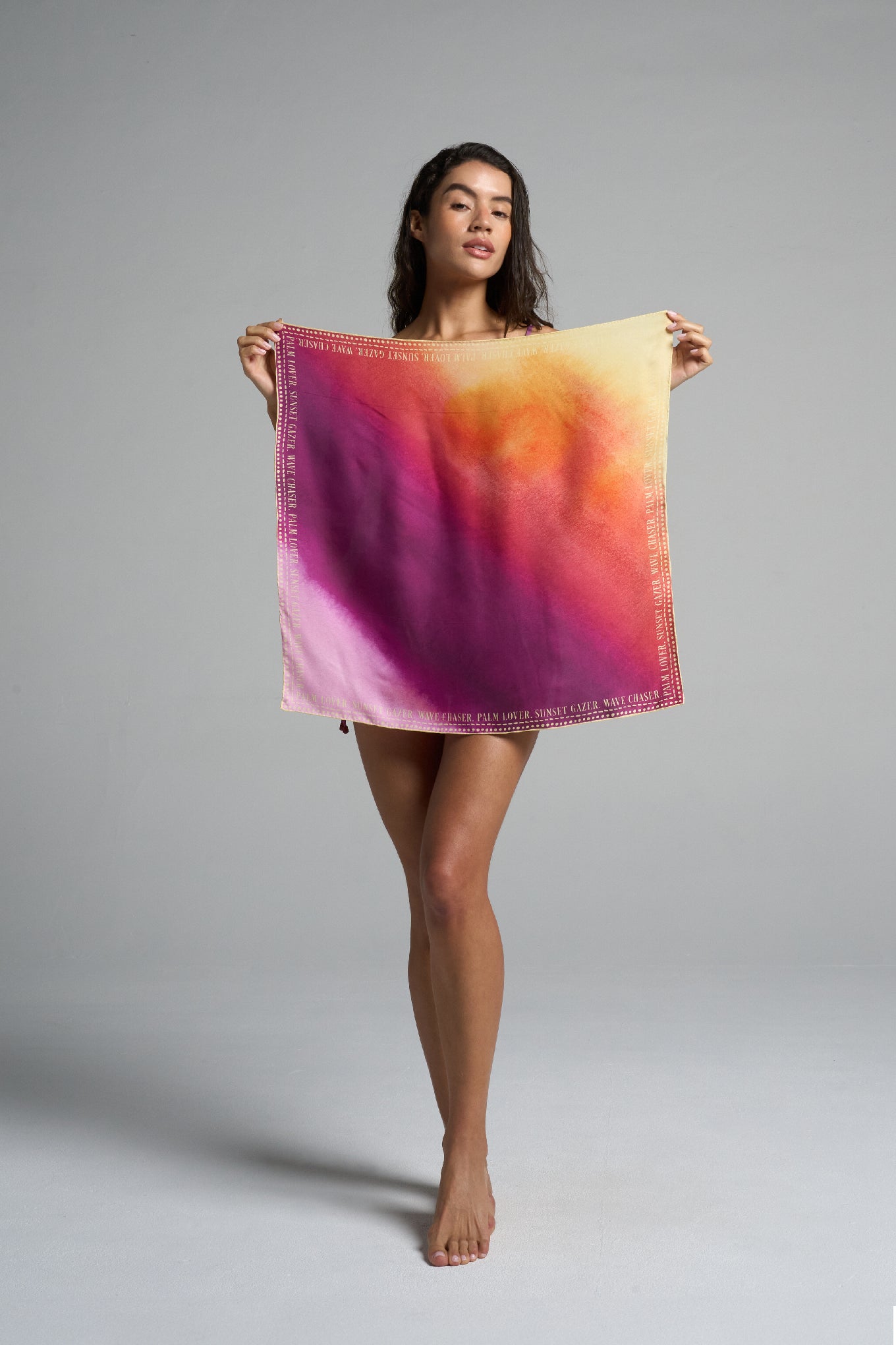 Introduce a touch of elegance to your accessory collection with the SIGAL Bandana Scarf Sunset. Made from 100% silk, this luxurious scarf offers a delicate, lightweight feel and a soft, lustrous finish that’s perfect for any season. The hand-painted gradient sunset print brings an element of timeless sophistication, making it a versatile addition to any wardrobe.