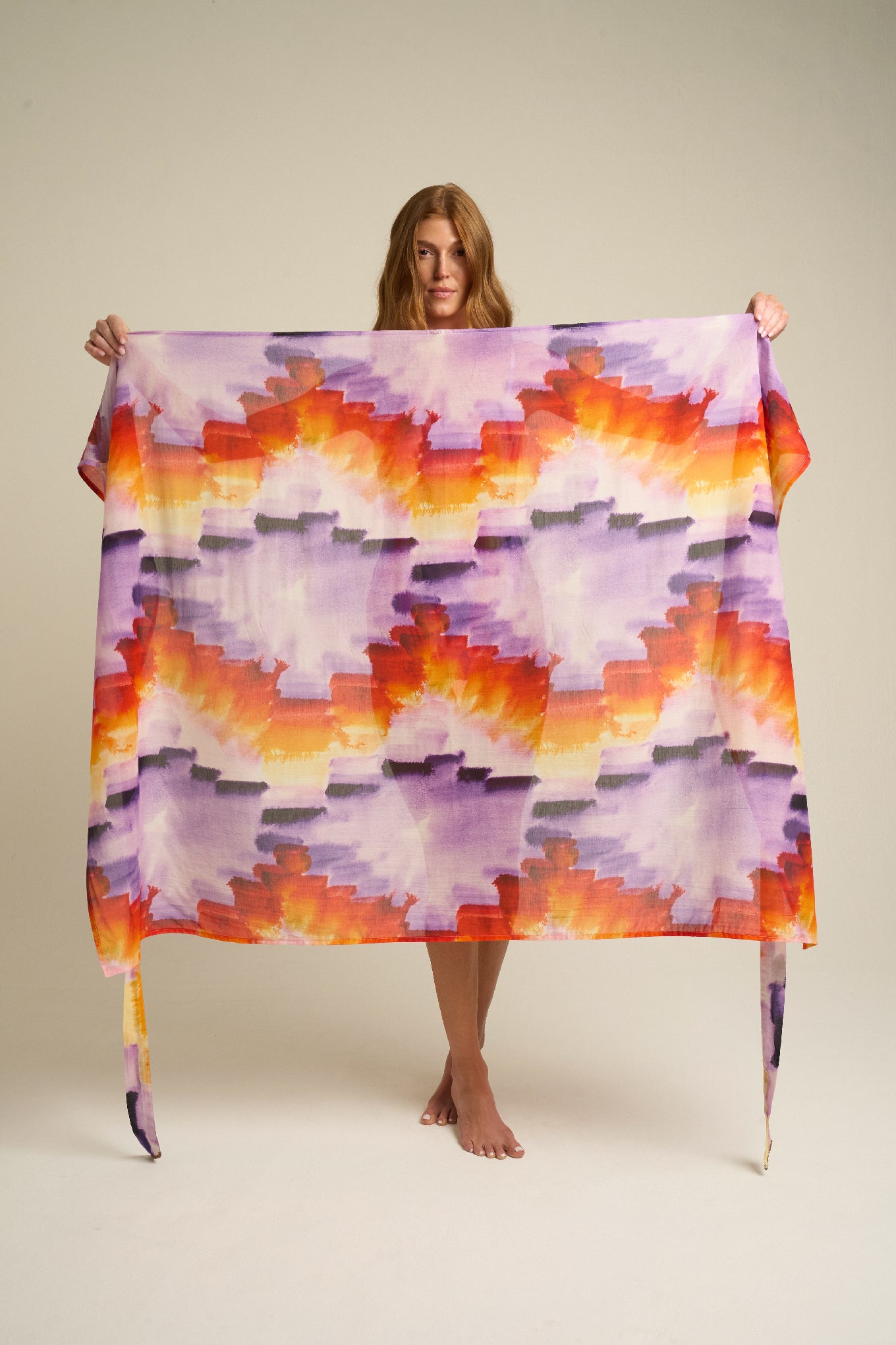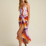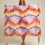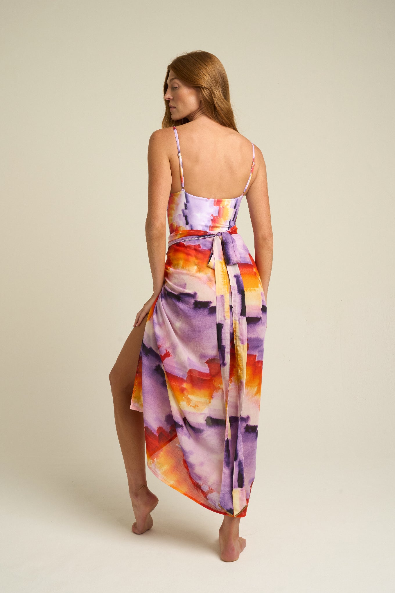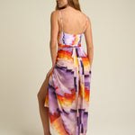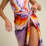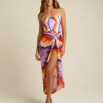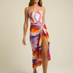 Vibrant and expressive, the SIGAL Sarong With Ties: Tapestra channels the spirit of summer adventure through color and form. Made from a smooth 51% viscose and 49% cotton blend, it features a flowing drape and an airy texture that flatters every movement. The hand-painted Tapestra print—an abstract fusion of purple, gold, and terracotta—captures the warmth of dusk skies and the artistry behind every SIGAL design.