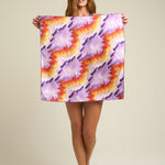 The hand-painted Tapestra print features a dynamic interplay of violet, amber, and golden tones in a geometric, woven-inspired pattern. Each brushstroke captures movement and depth, evoking the richness of textile artistry reimagined through a modern, painterly lens.
