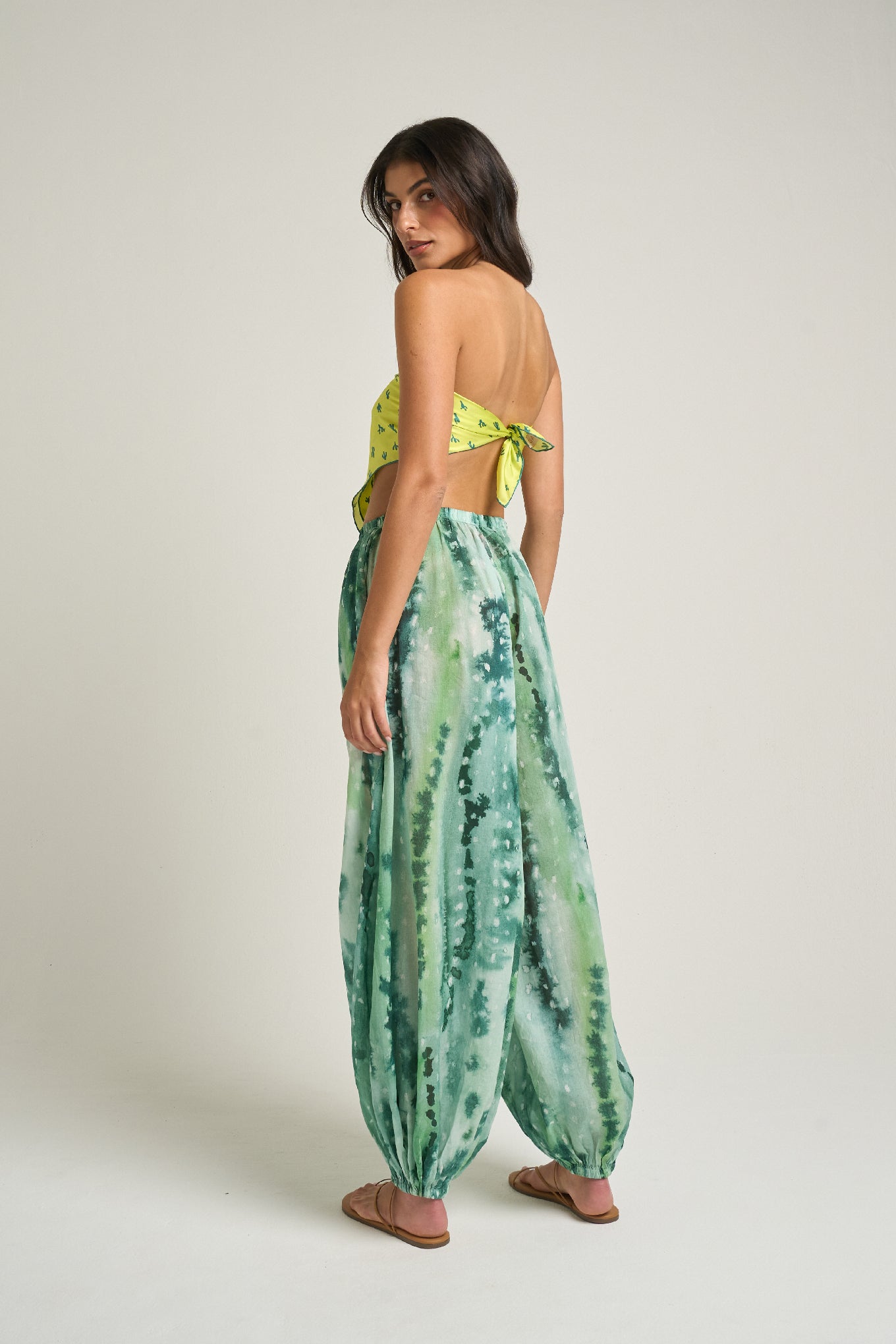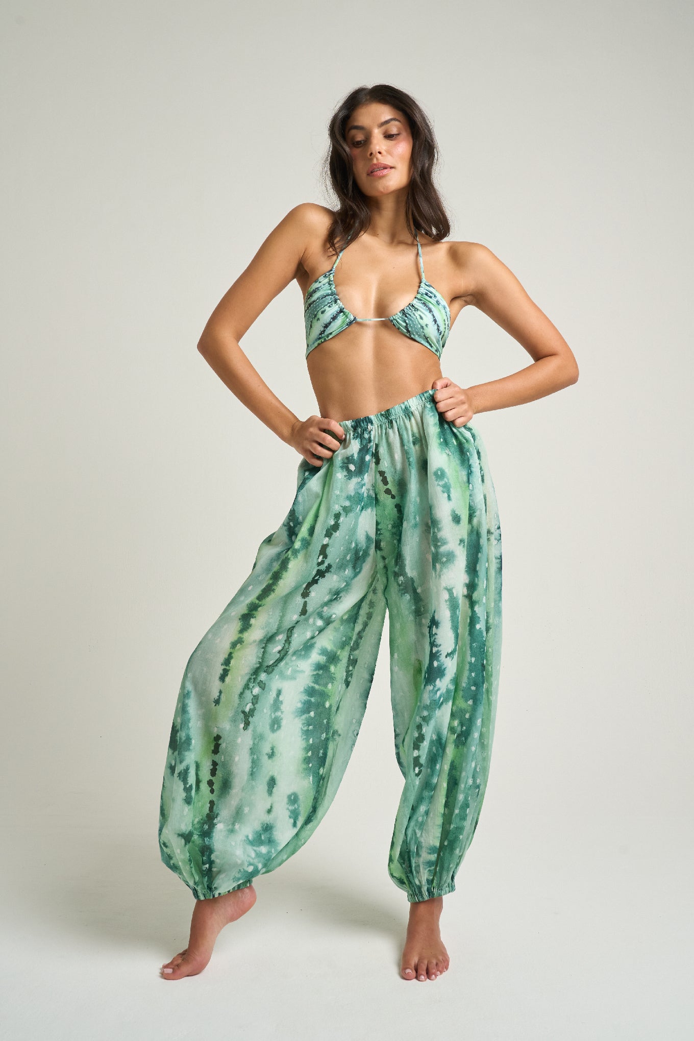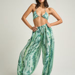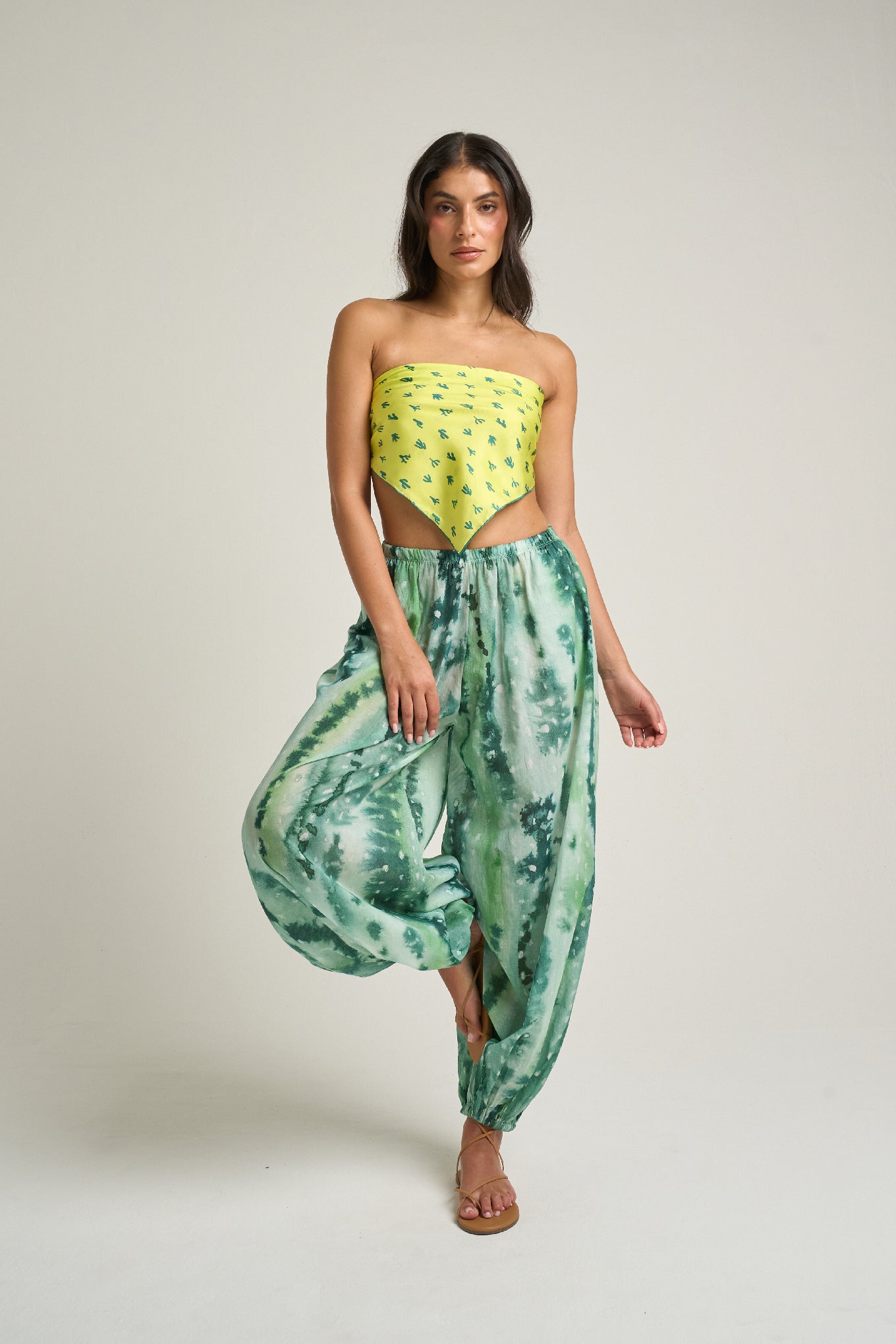 The hand-painted Saguaro print evokes the skin of cactus plants in the desert. Both refined and versatile, these pants are ideal for everything from lounging to evening strolls by the shore.