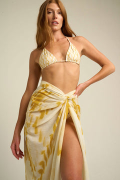 The SIGAL Knot One Piece Swimsuit: Ochre radiates warmth and confidence. Made from 81% recycled polyester and 19% elastane, it features a halter neckline and a flattering front knot that creates subtle gathering at the waist. The ochre gradient design transitions from sunlit gold to soft cream, embodying effortless coastal elegance.