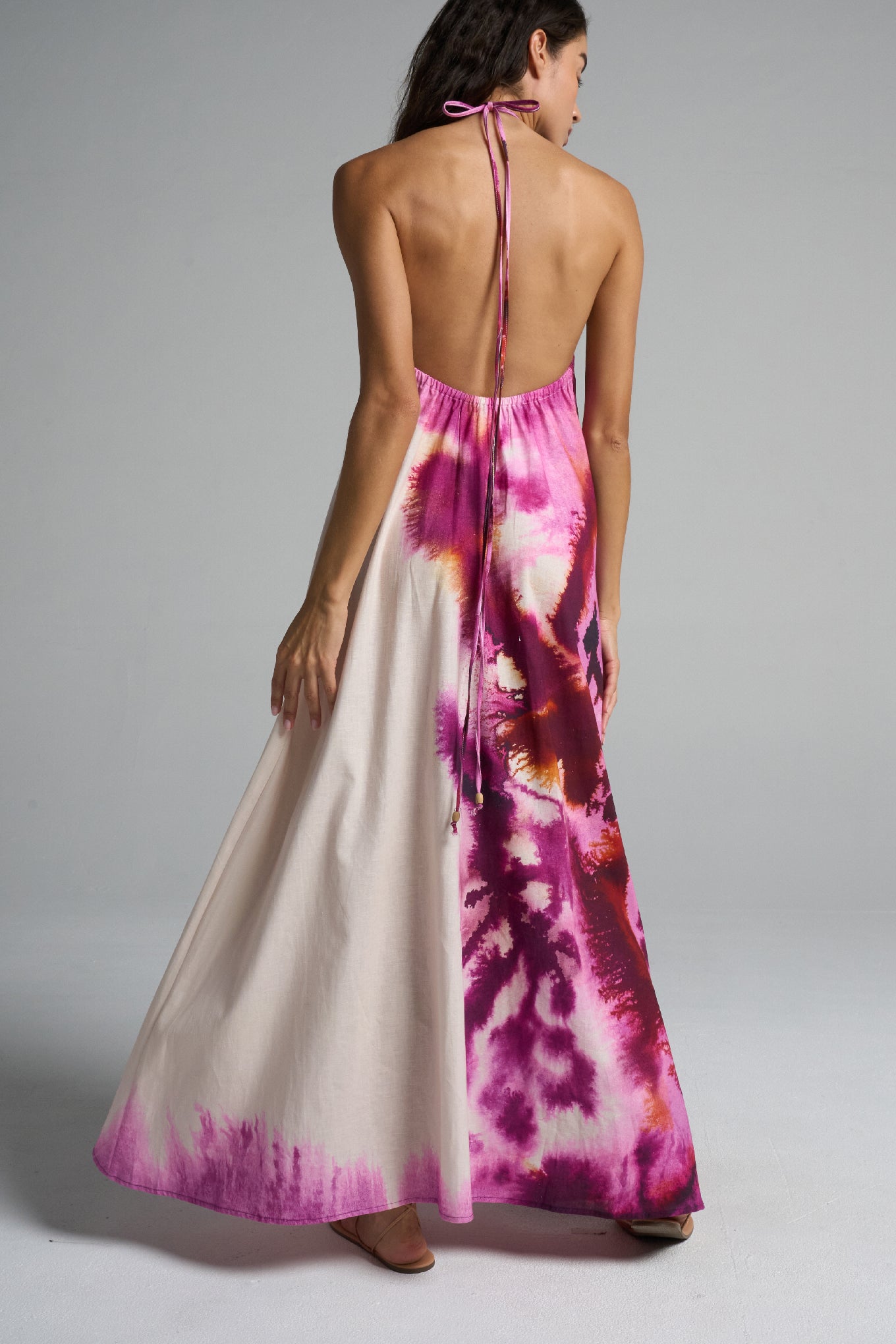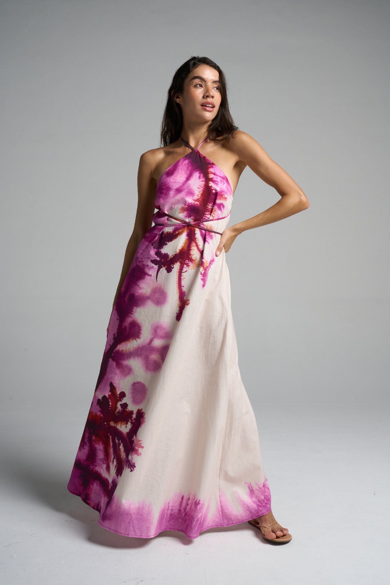 Embrace effortless elegance with the SIGAL Maxi Halter Dress Algea. Crafted from a soft blend of 55% linen and 45% cotton, this dress offers a breezy, lightweight feel perfect for warm days and evenings. Featuring a hand-painted pink algae design by SIGAL, the dress captures the serene beauty of a peaceful morning, adding a unique and artistic touch to your wardrobe.