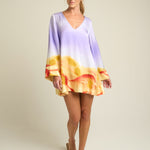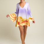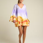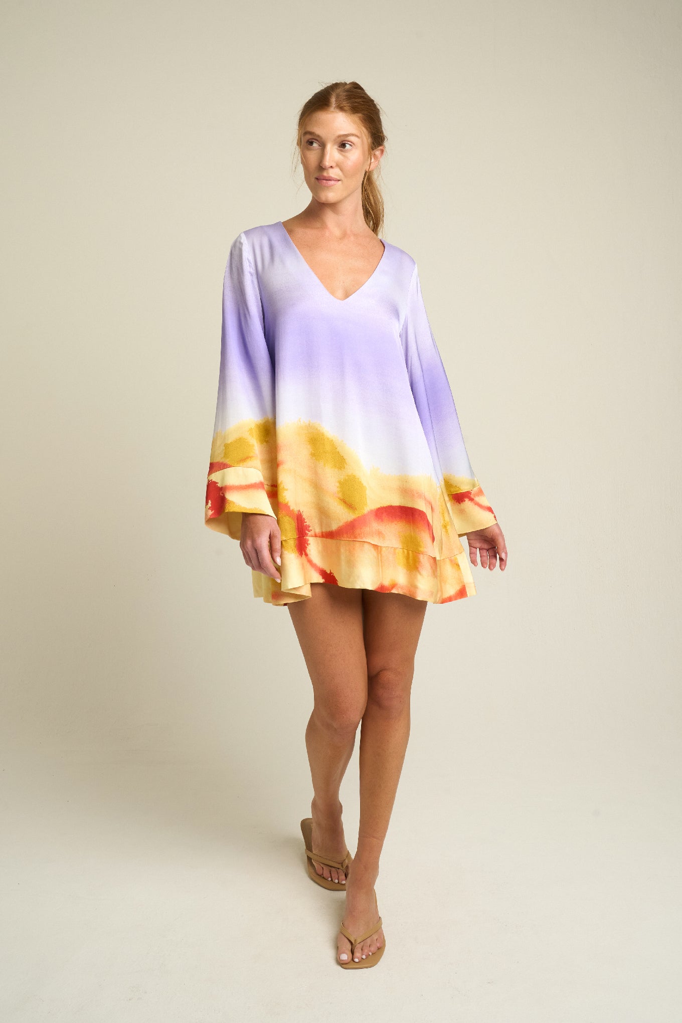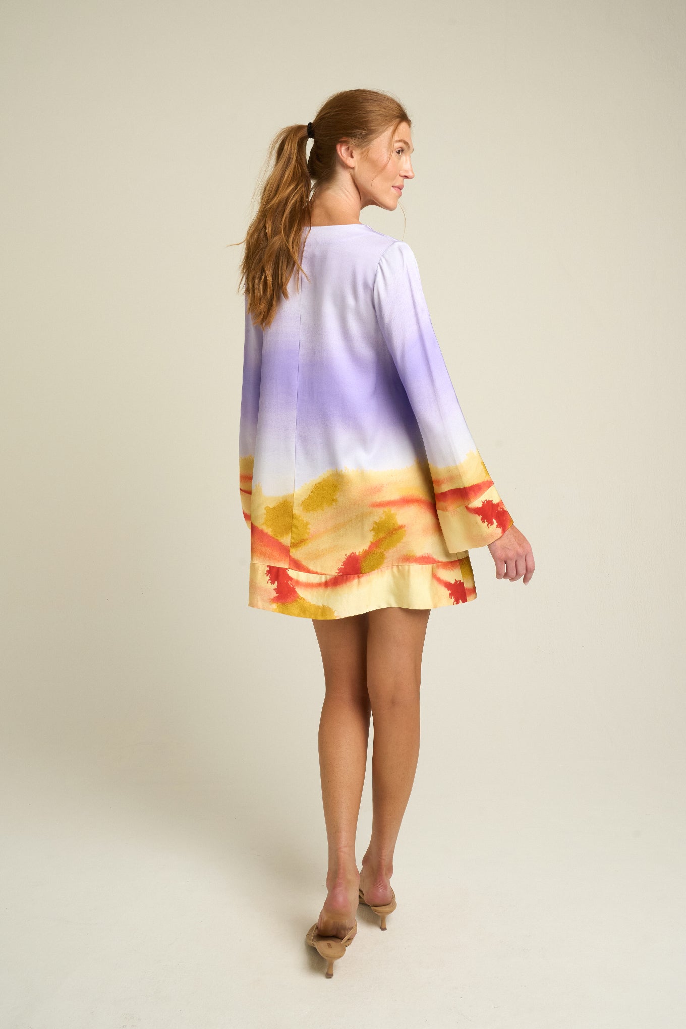 The hand-painted Dunas print captures the hues of desert dunes at sunset, blending soft lilac and golden terracotta tones in a fluid, watercolor gradient. Each piece is a work of art, reflecting a seamless fusion of elegance and artistic expression that defines SIGAL’s signature aesthetic.