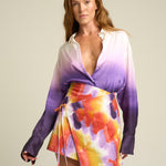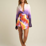 The hand-painted Tapestra print features vibrant shades of violet, gold, and terracotta, blending together in a dynamic, geometric pattern that captures movement and color with every step. Each piece reflects a balance of artistry and ease, making it a statement piece that transitions seamlessly from day to night.
