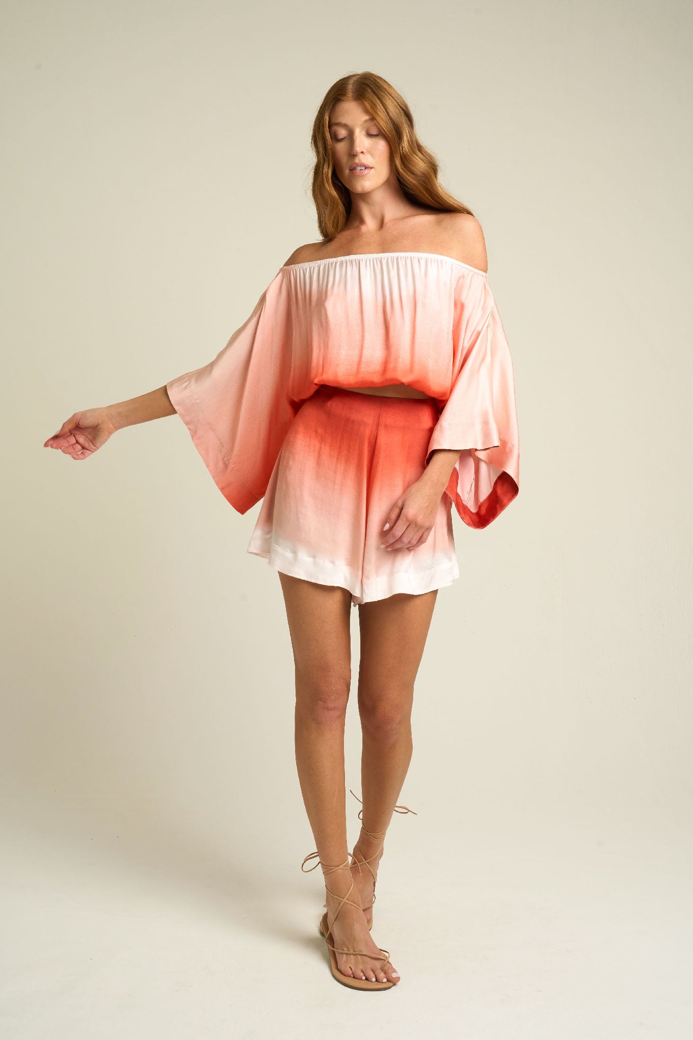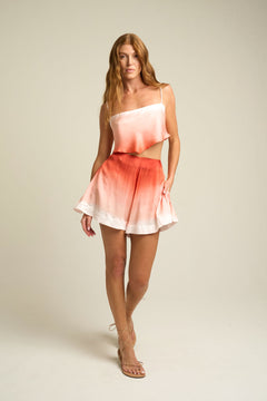 The hand-painted terracotta print enhances the piece with warm, sun-kissed tones that evoke the glow of golden-hour light. Its lightweight construction makes it ideal for warm weather, easily transitioning from daytime wear to evening gatherings. Designed to be both comfortable and refined, this top embodies relaxed sophistication with a subtle artistic touch.