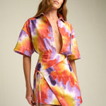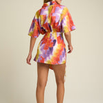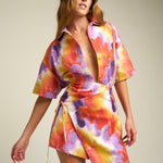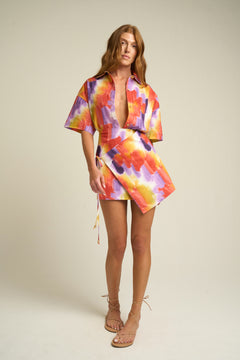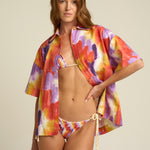 The hand-painted Tapestra print combines bold violet, gold, and terracotta tones in a striking abstract pattern that evokes energy and creativity. The pocket detail and clean button-down finish add structure while maintaining an effortless, laid-back appeal.