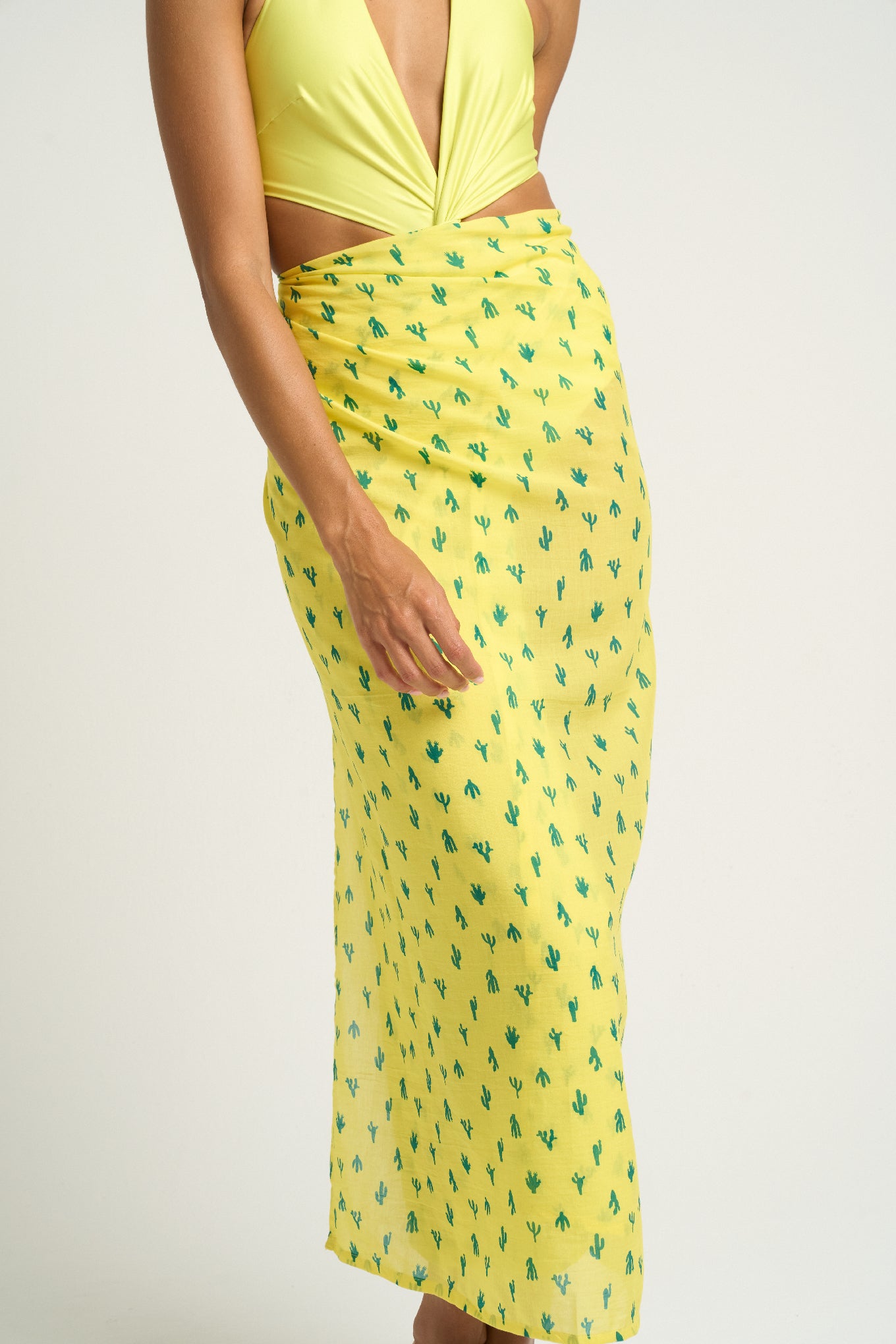 The SIGAL Sarong With Ties: Cactus Yellow brings playful sophistication to a timeless resort essential. Made from a soft 51% viscose and 49% cotton blend, it offers a fluid drape and breathable feel that moves beautifully with the body. The cheerful cactus print over a warm yellow base creates a lively yet polished statement.