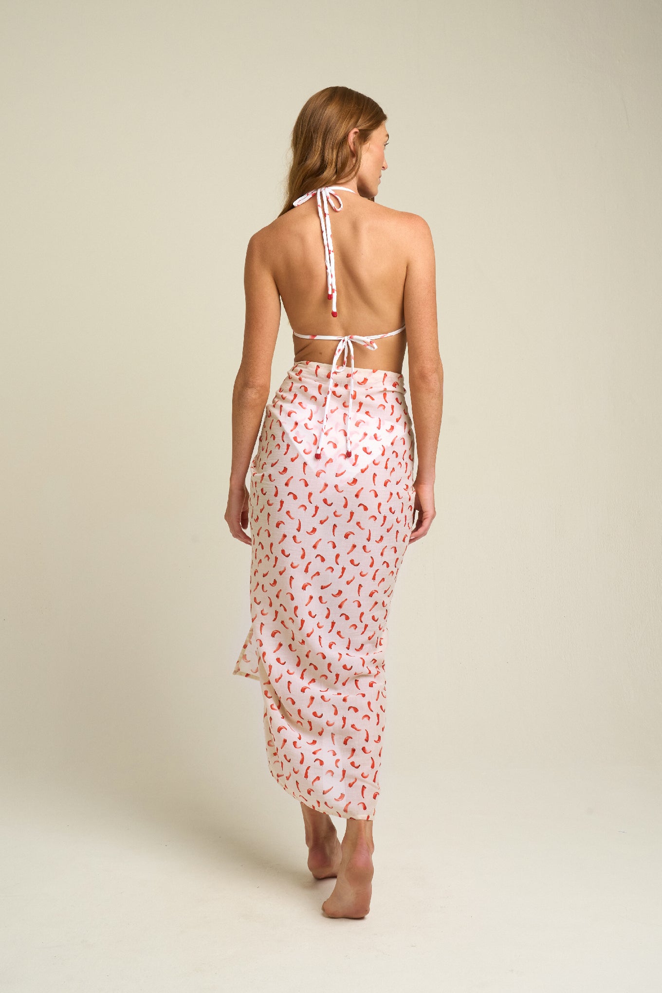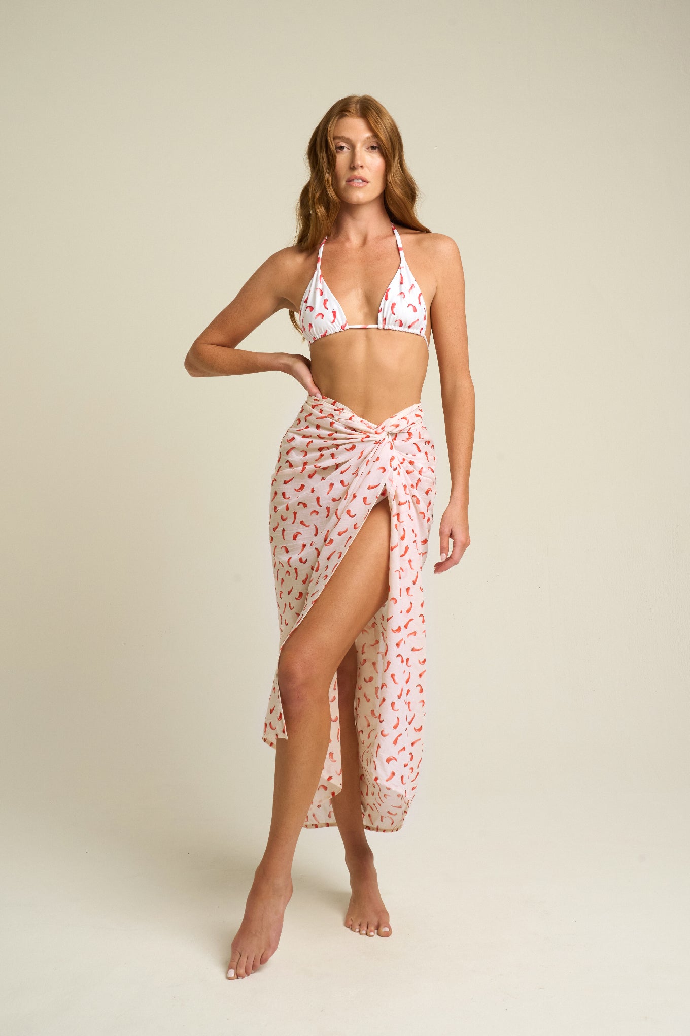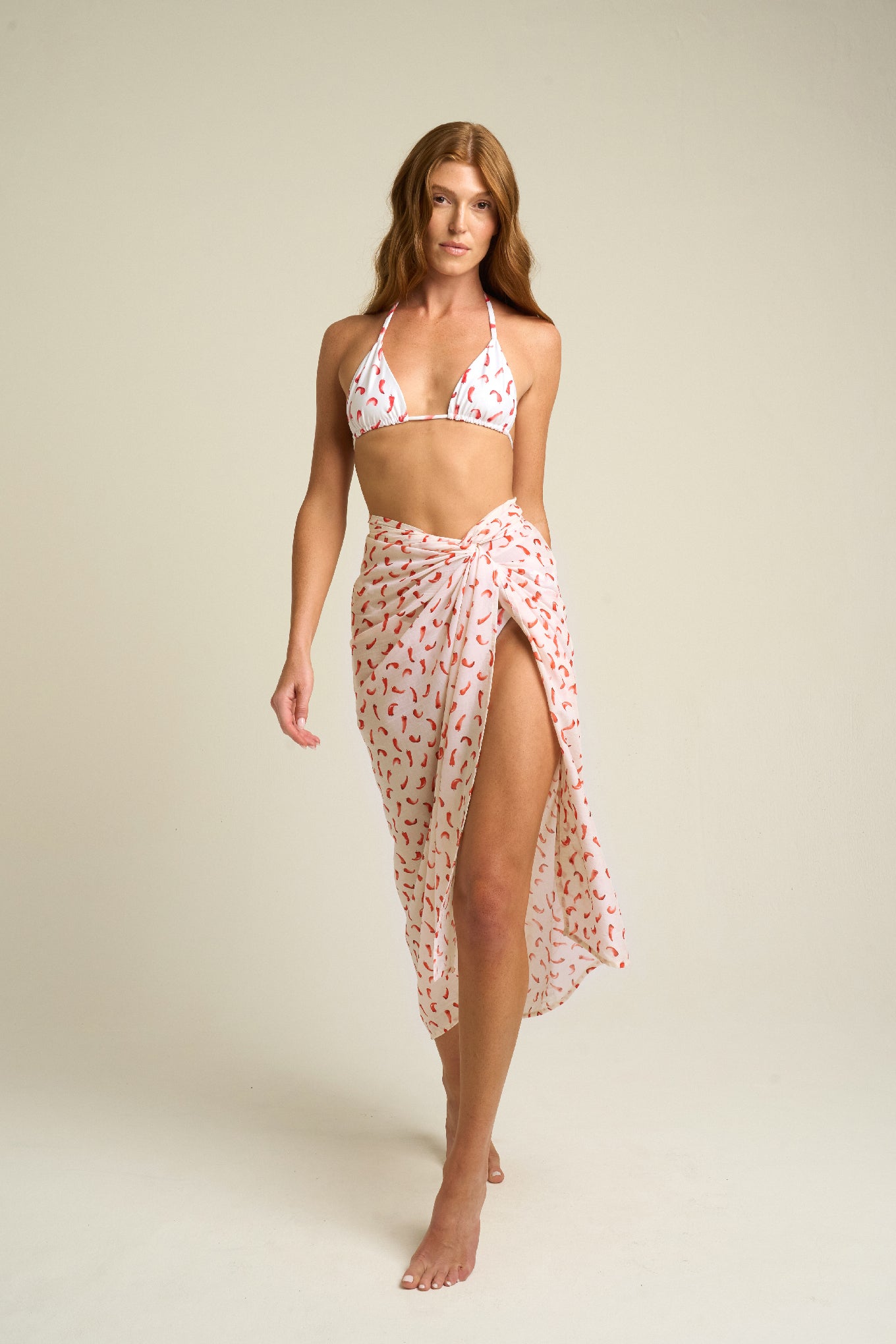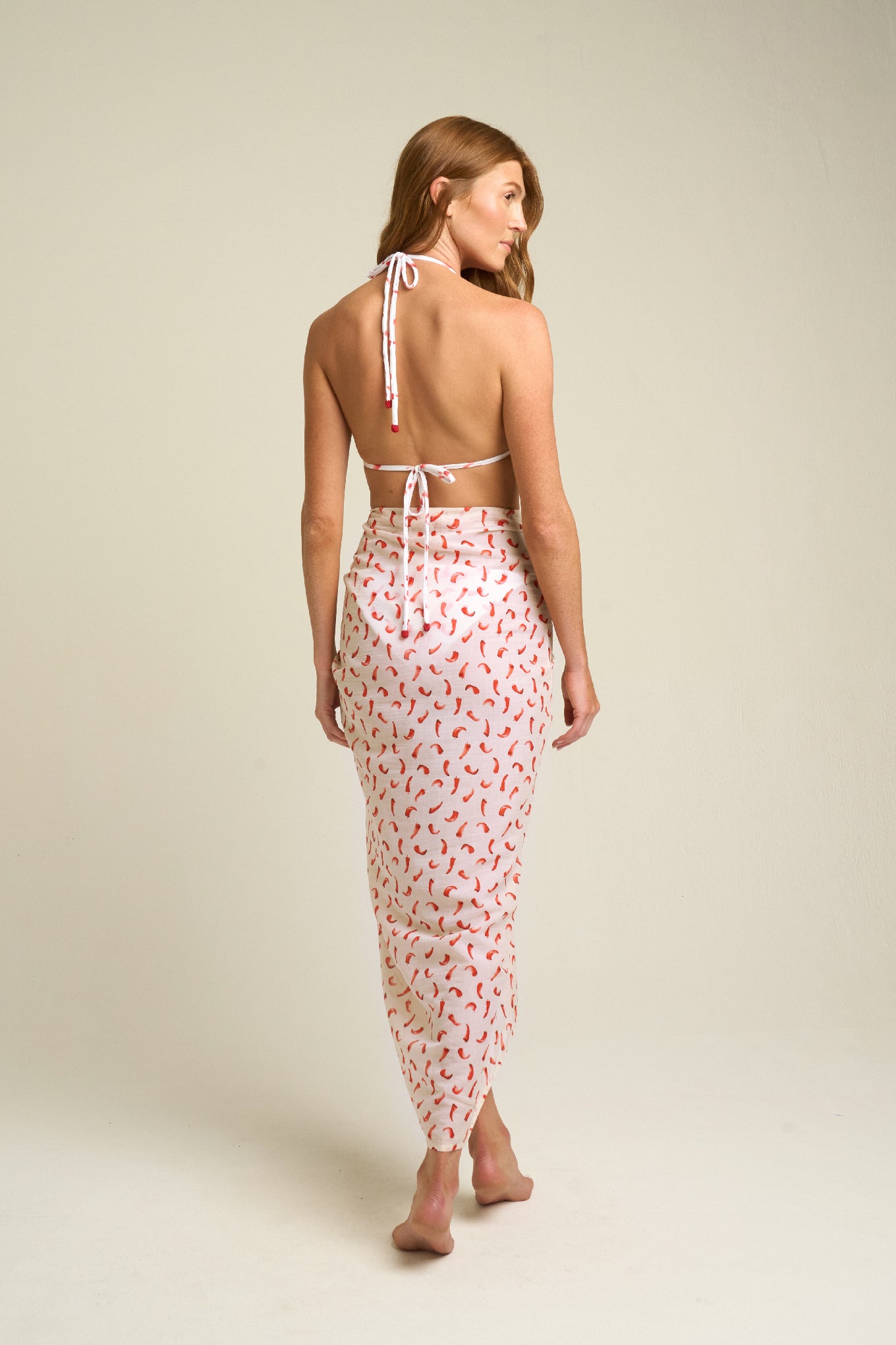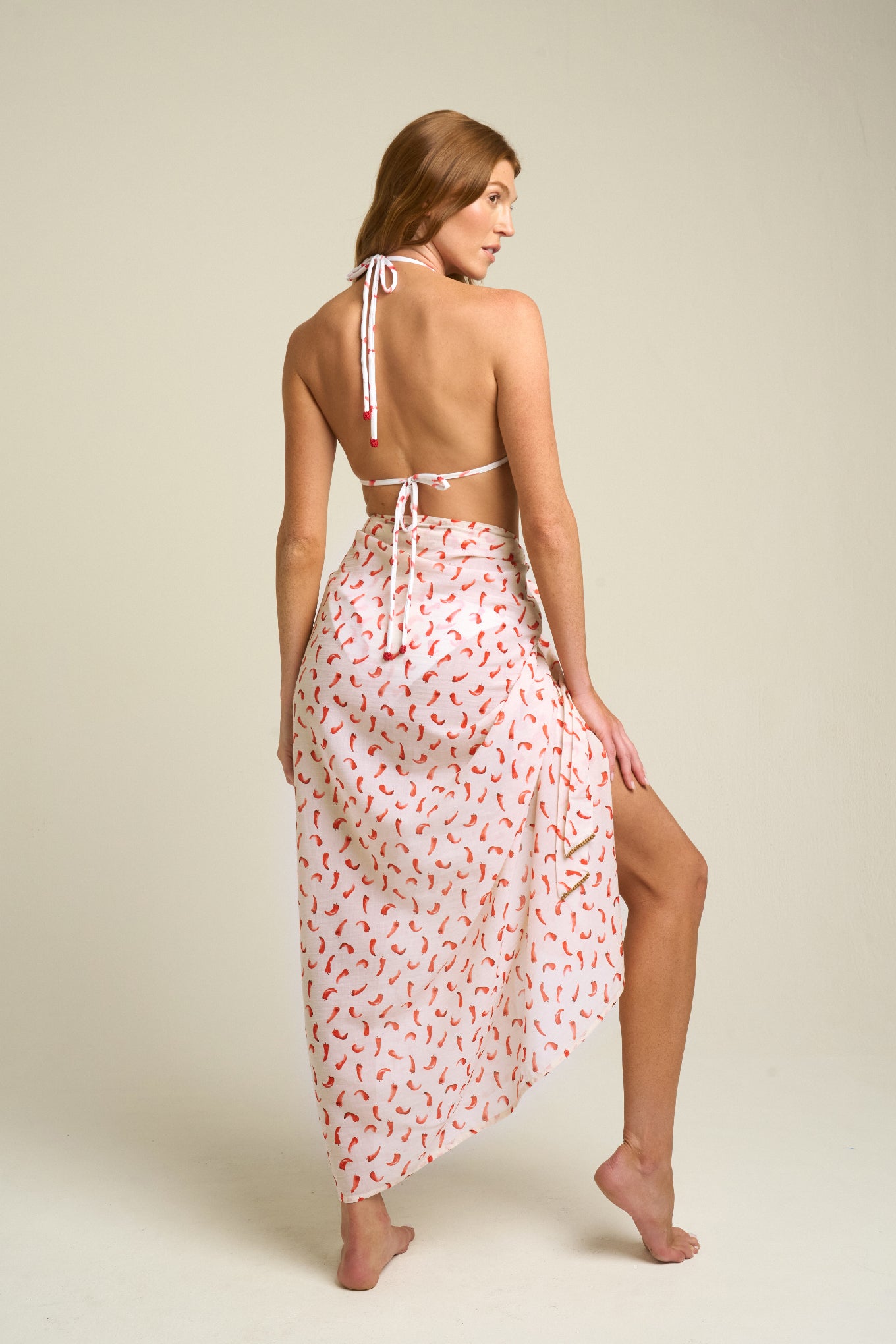 Crafted from a soft blend of 51% viscose and 49% cotton, the SIGAL Sarong With Ties: Chilies is a playful yet timeless beach essential. The lightweight fabric drapes effortlessly, offering a gentle flow and a flattering silhouette. Its hand-painted red chili motif brings a touch of humor and boldness to a refined resort piece, capturing SIGAL’s signature balance of artistry and ease.