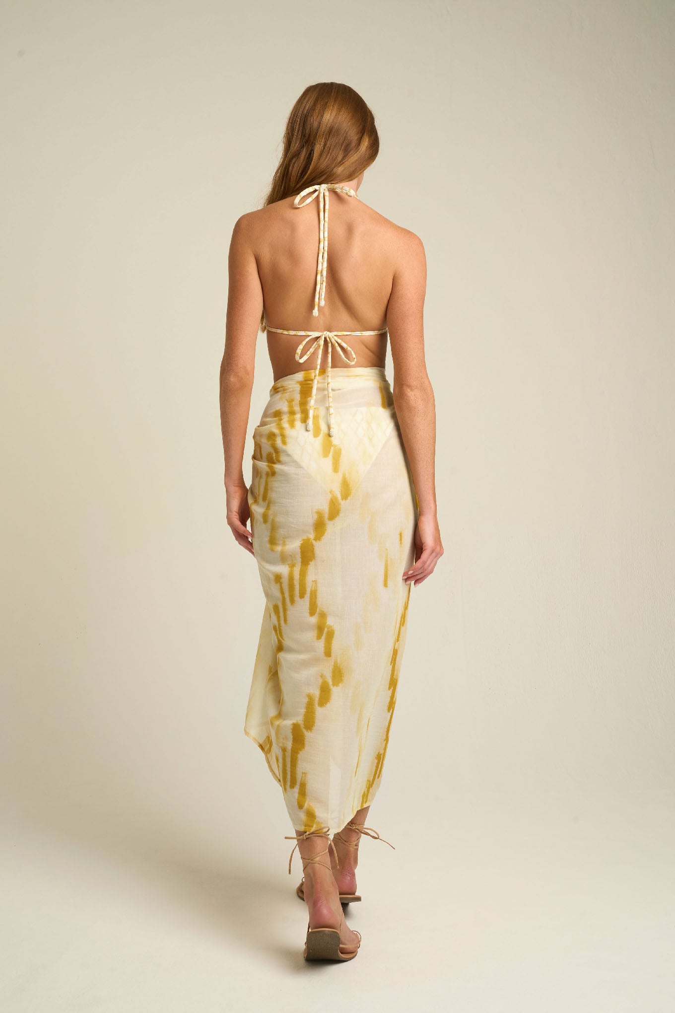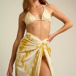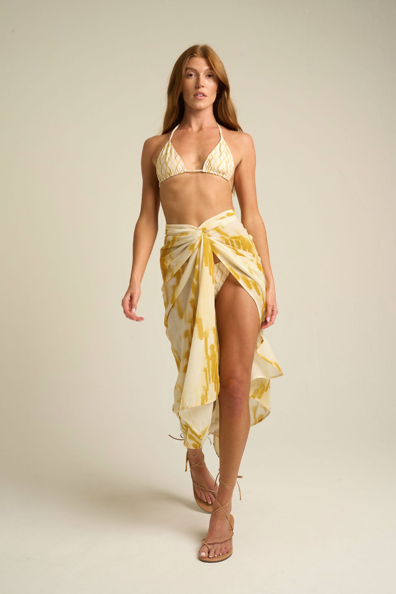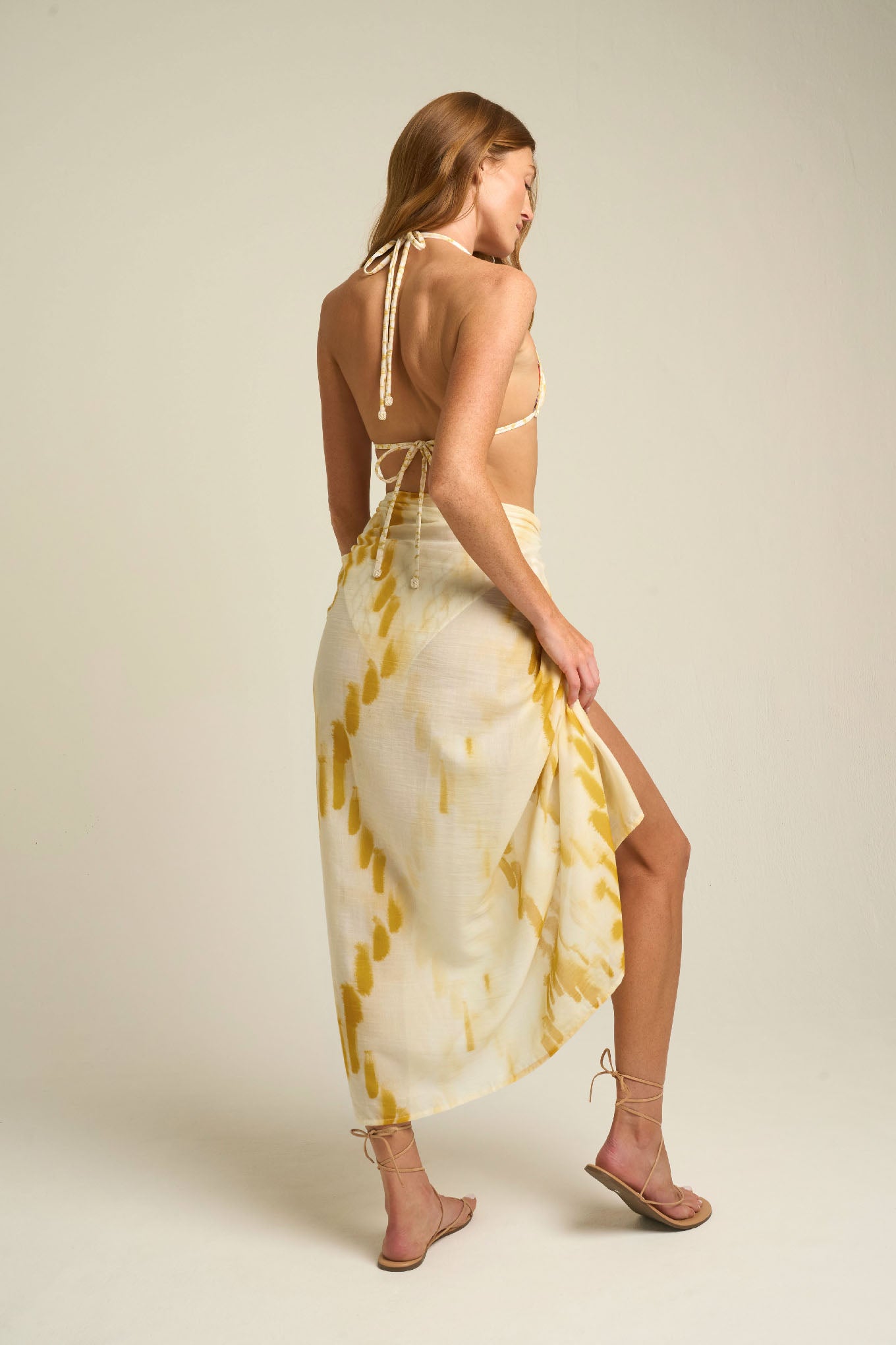 The SIGAL Sarong With Ties: Okee embodies understated elegance and effortless movement. Made from a 51% viscose and 49% cotton blend, it offers an ultra-soft feel and fluid drape, making it an ideal piece for both lounging and exploring. The hand-painted Okee print features warm golden tones that radiate subtle sophistication, reminiscent of soft sunlight on natural textures.