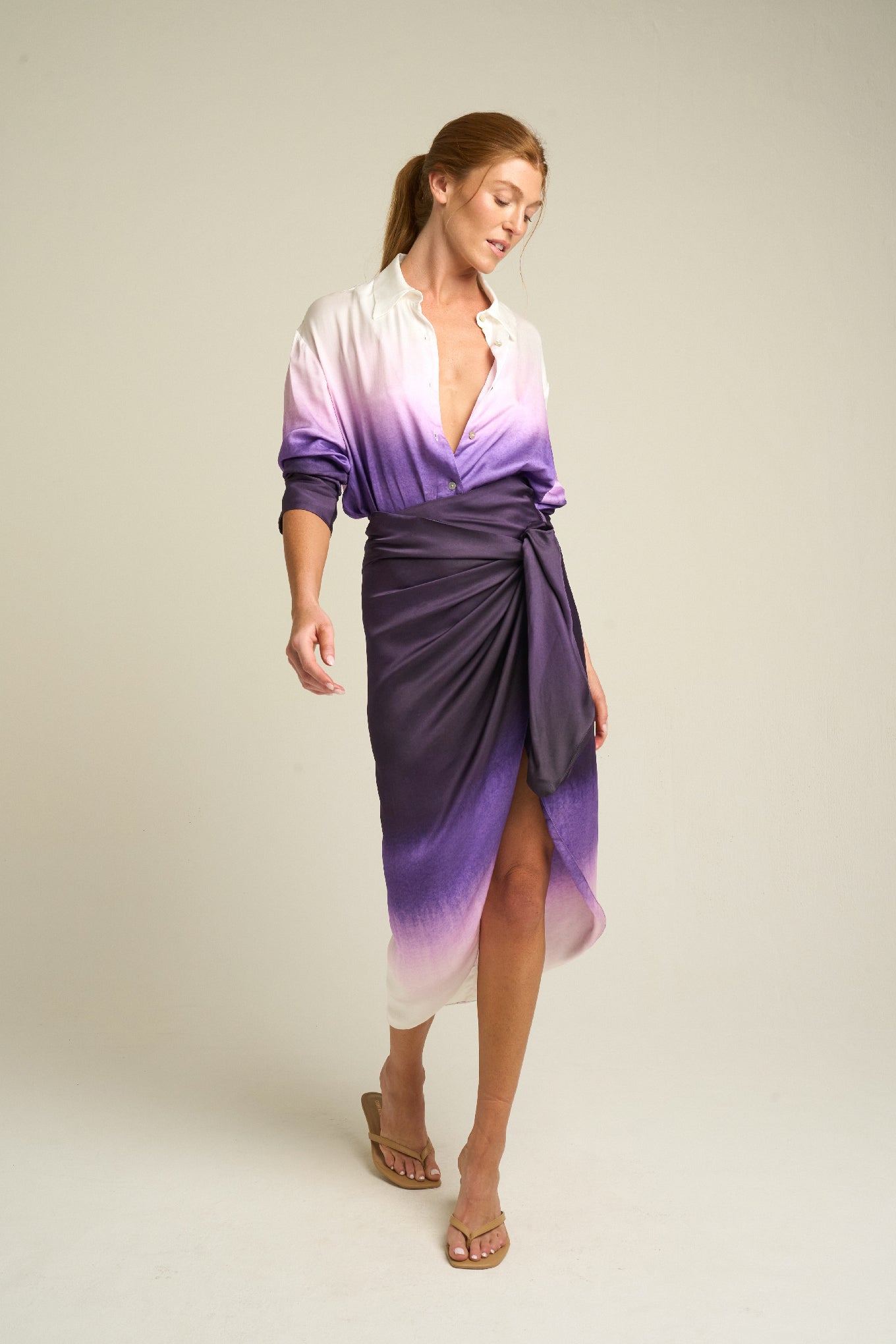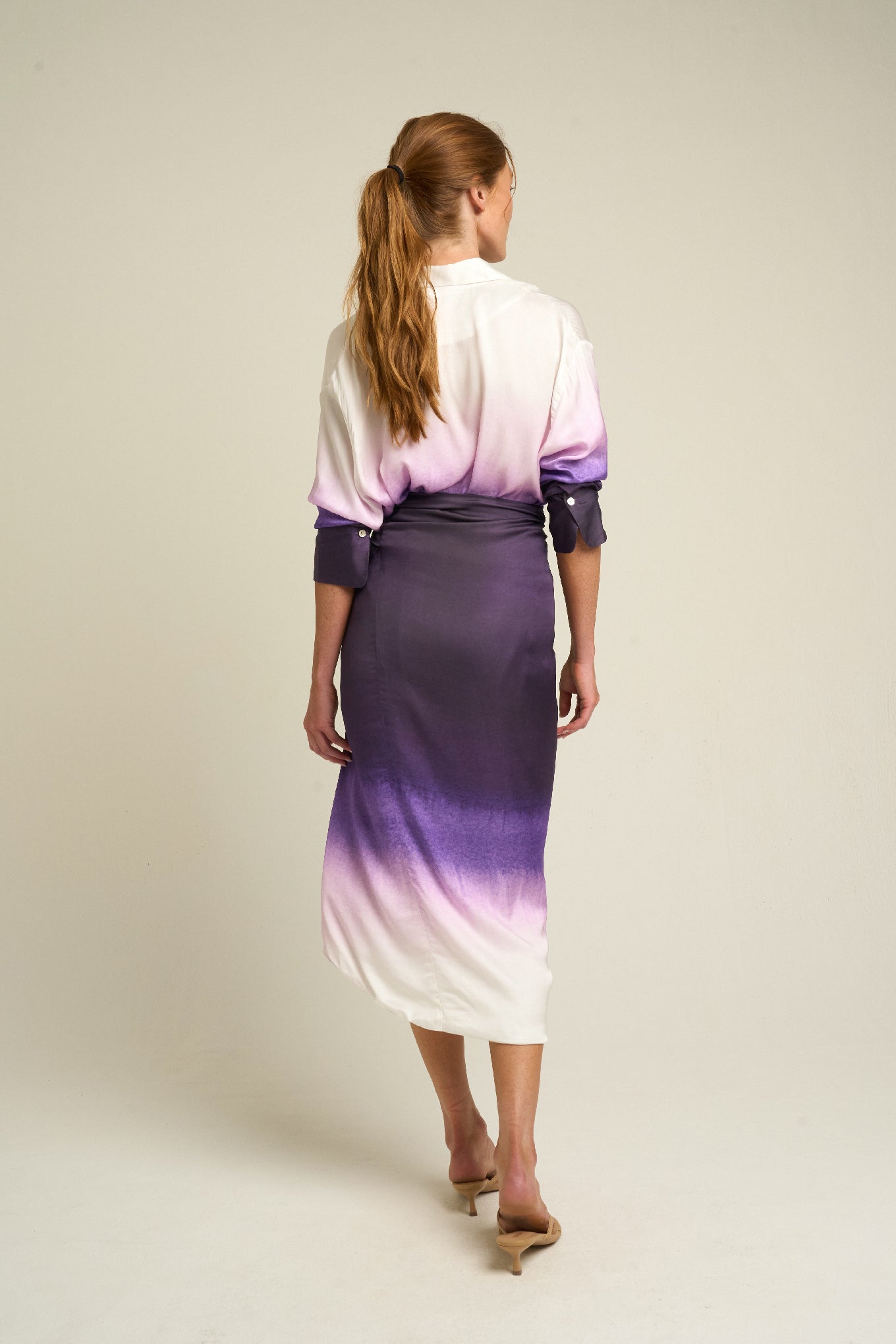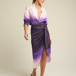 The hand-painted Dusk print fades from deep violet to soft lilac, capturing the serene transition of twilight skies. Its smooth texture and natural sheen enhance the print’s depth and luminosity, making it a striking piece that pairs perfectly with both casual and elevated looks. Designed to coordinate seamlessly with the matching SIGAL Long Sleeve Shirt: Dusk, it brings a sense of harmony and elegance to your wardrobe.